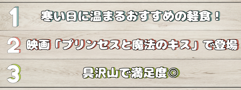 寒い日に、ショーやパレードで長時間外で待つ時や、冷え切った体に温かいスープは最高に美味しいですし、体も温まります!
