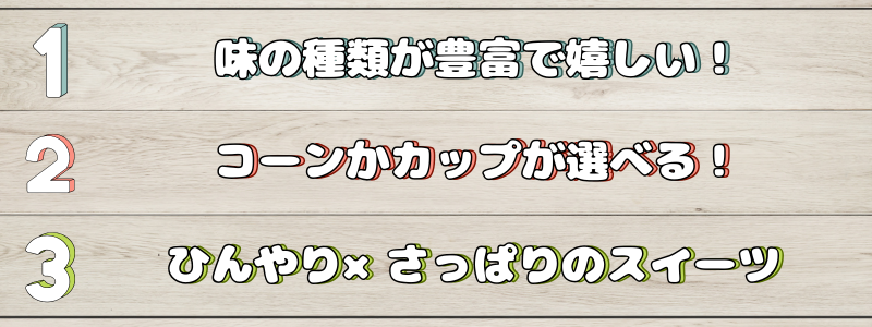 味の種類も豊富で、食後にさっぱりとしたスイーツが食べたい時に、おすすめのメニューとなっています!